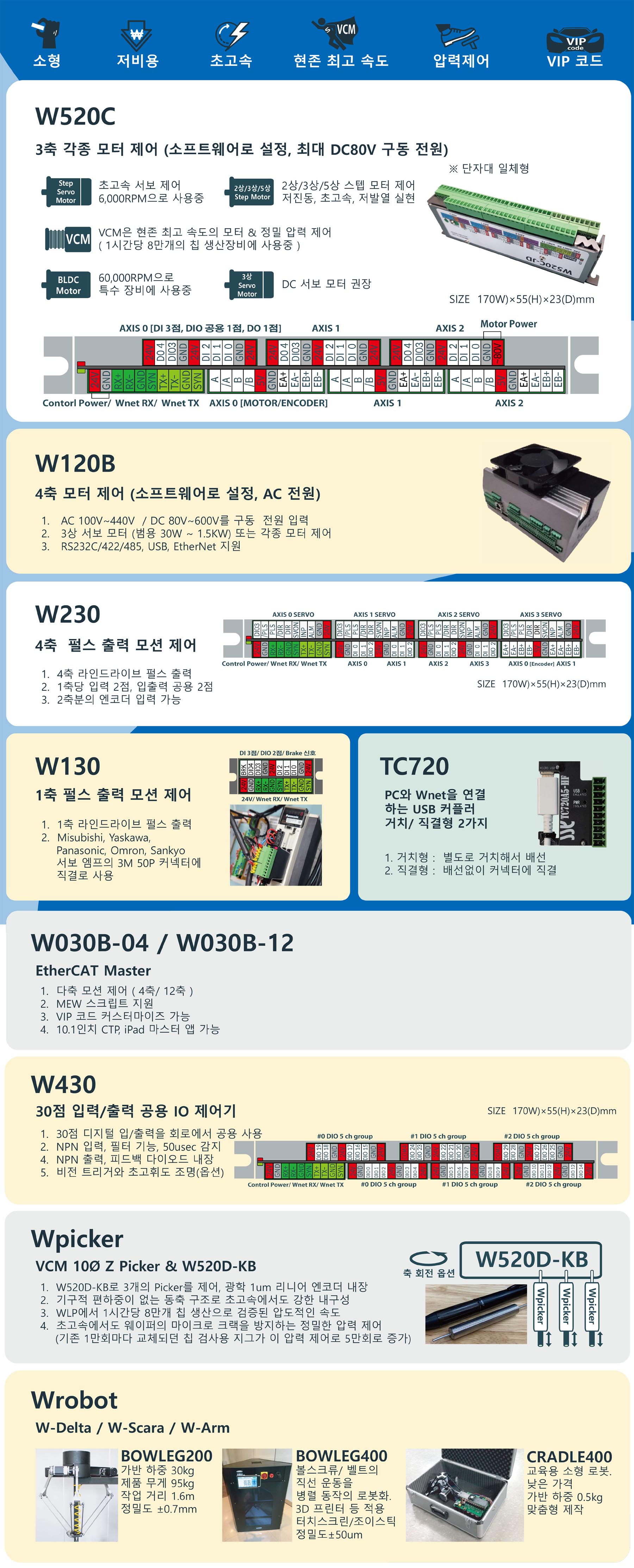 ▶ W520으로 제어 가능하며, 스텝 서보와의 조합으로 최고의 가성비 로봇을 제공 가능.